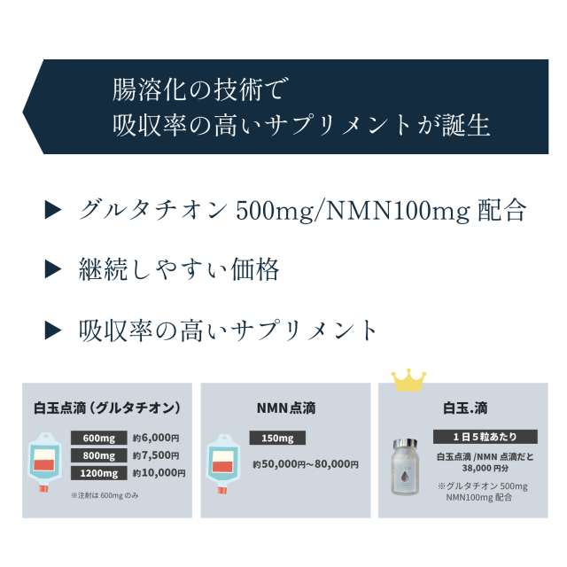 ※白玉.滴は同様に流行しているNMNと合体したサプリメントを設計しました